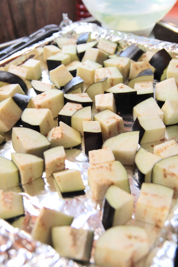Anyone who knows me and my famous patience will tell you that I will not individually caress eggplant slices. For that I have my children. But one Friday afternoon, a light-bulb lit above my head. I enveloped my cubed eggplants in sweet chili sauce, the type you buy at an Asian grocer. The silky, slippery texture covered the sponge like eggplant flesh, preventing them from absorbing much oil or drying out. I roasted my eggplants in the oven and they came out soft, brown and yummy. So long, dry and chewy, we got a new keeper.