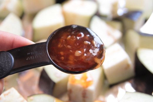 4. Pour chili sauce on the eggplant cubes and mix well, then repeat with the oil and sprinkle salt.