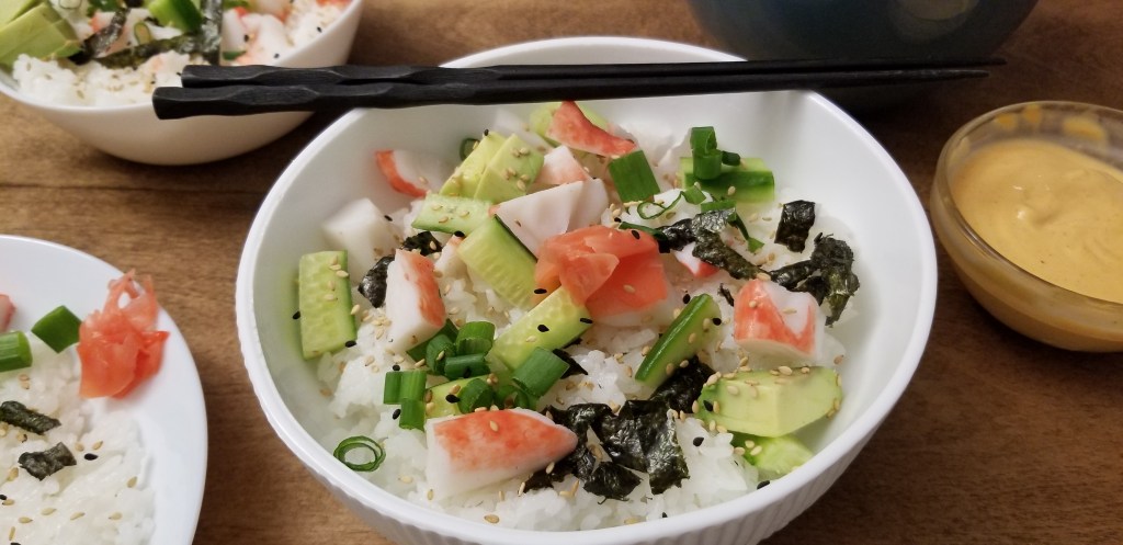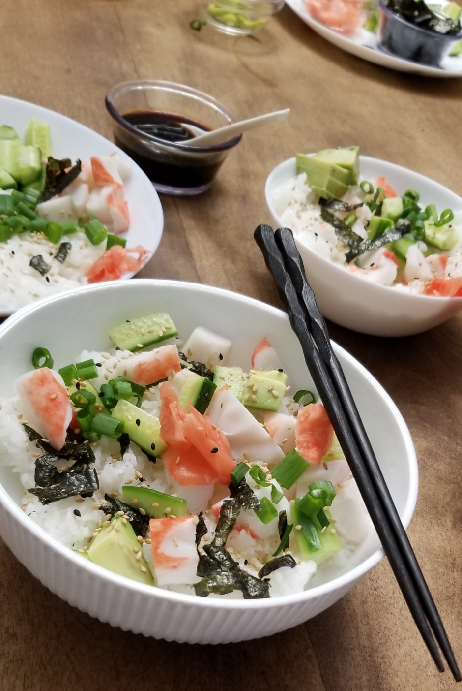 Sushi bowl is a great “make it yourself” kind of meal, so this isn’t actually an organized recipe. It is all up to you! The ingredients are what made California rolls so popular: mock crab sticks, dry Nori seaweed, avocado, cucumbers and sushi rice. Some people like carrot sticks in theirs, so feel free to add those too!