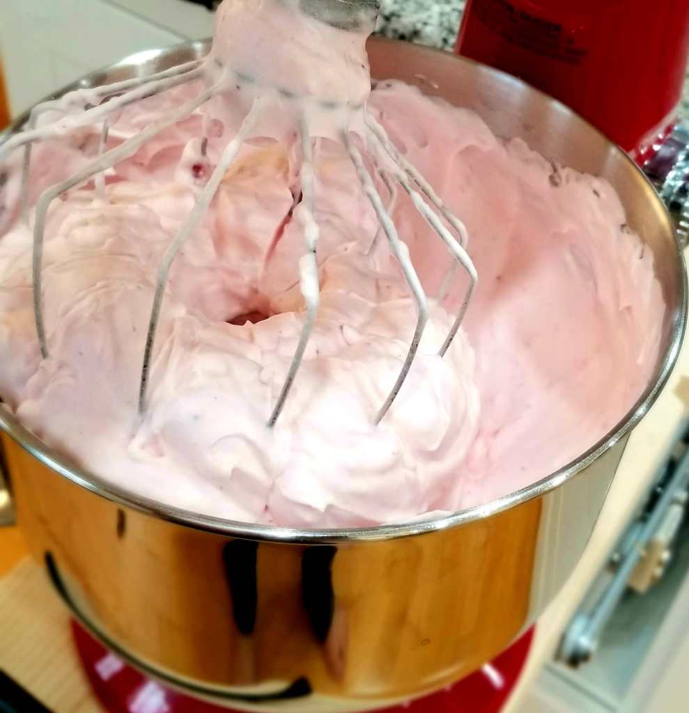 - Continue mixing on high for 10 minutes at least, watching in wonder how the pink, pretty fluff keeps rising until the mixture fills the bowl.