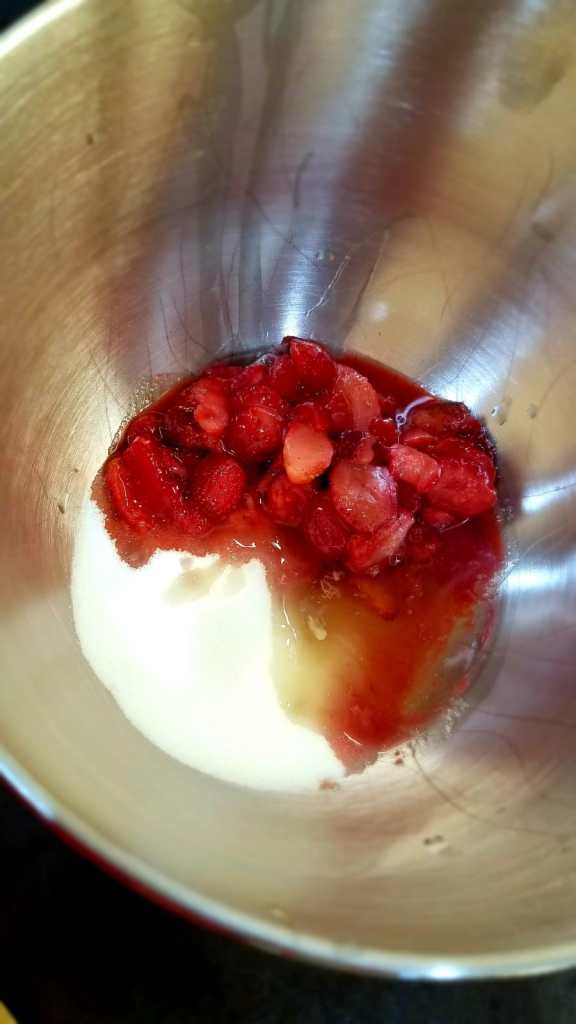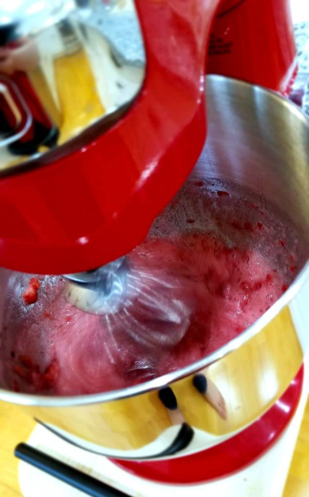 - Place egg white, sugar and strawberries in the mixer bowl and start mixing slowly, increasing the speed to medium, then high.